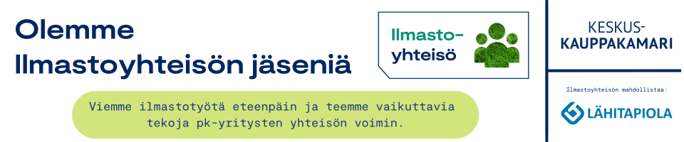 Olemme olleet vuonna 2025 mukana Keskuskauppakamarin ilmasto-ohjelmassa, jonka yhteydessä teimme scope 1-2 päästöjen laskennan myös vuodelle 2024. Jatkamme vuonna 2026 Keskuskauppakamarin ilmastoyhteisön jäsenenä, tavoitteenamme vahvistaa omaa osaamistamme scope 3 -päästölaskennassa sekä päästövähennyssuunnitelmamme kehittämisessä.
